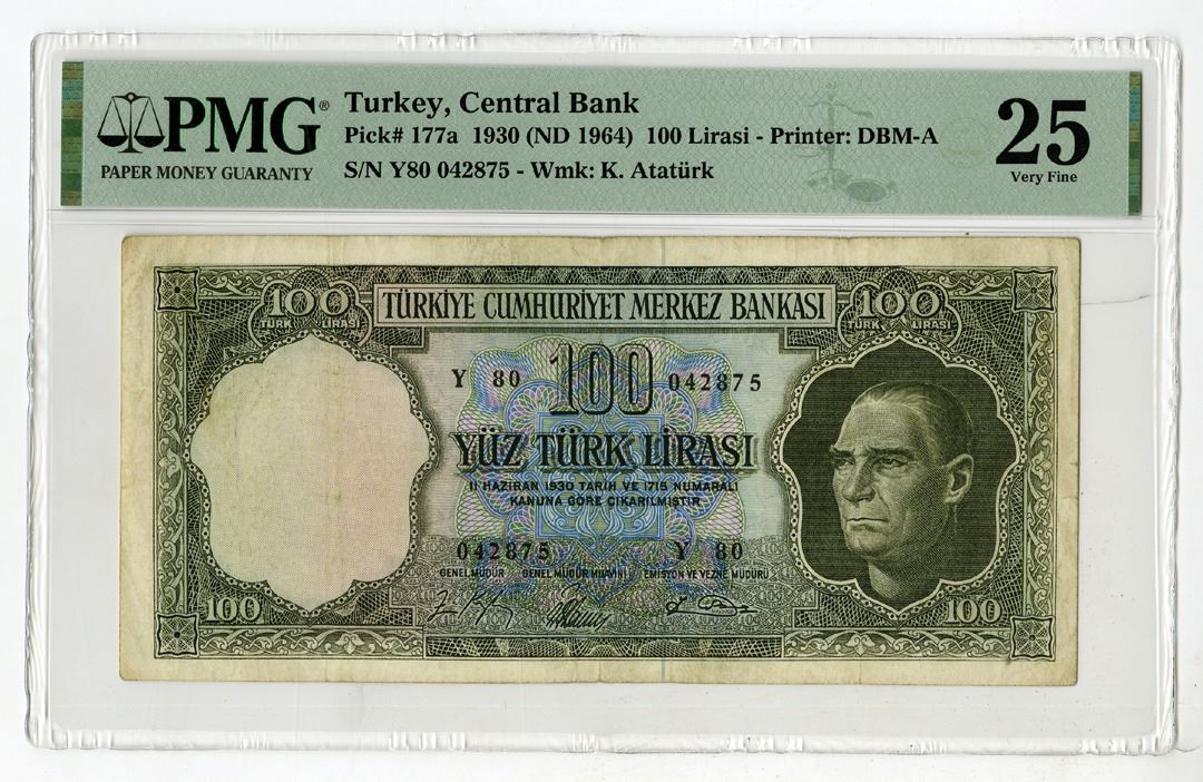 Turkey, 1930 (ND 1964). 100 Lirasi, P-177a, Issued Banknote, Olive on blue with lilac and m/c guilloche, Portrait of President Kemal Ataturk at right, Back is olive on blue with Youth Park and bridge in Ankara at center, S/N Y80 042875, PMG graded Very Fine 25, DBM-A.
