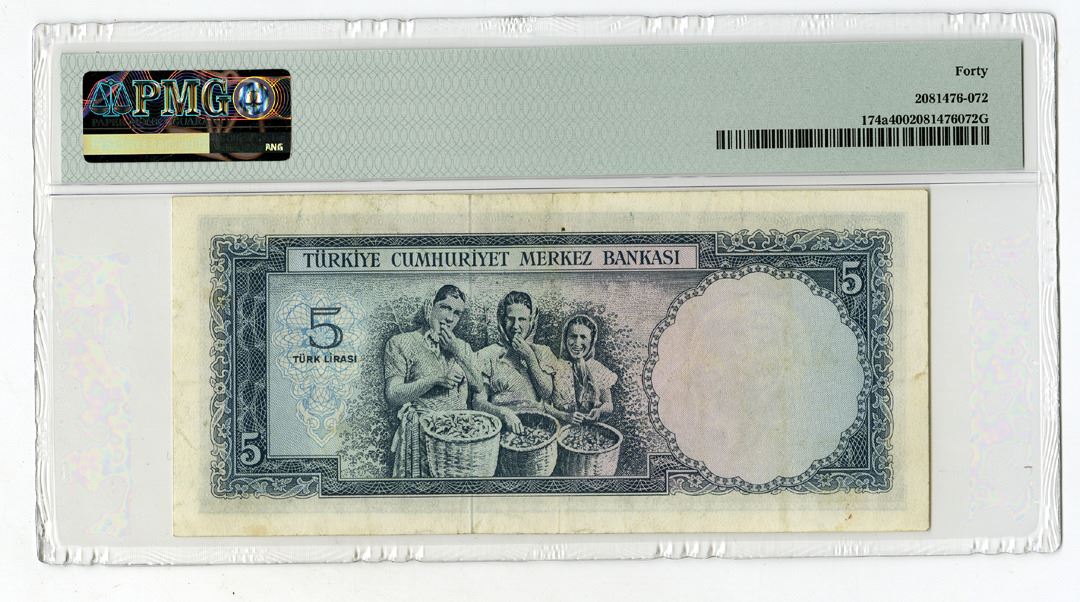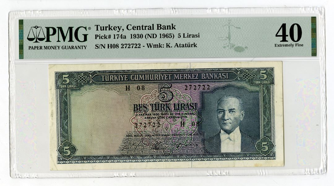 Turkey. 1930 (ND 1965). 5 Lirasi, P-174a, Issued banknote, Blue-green, S/N H08 272722, Watermark: K. Ataturk, PMG graded Extremely Fine 40 .