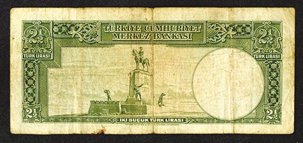 Turkey. 2-1/2 Lira. P-126. Ataturk at right end. Very Fine. Light stain at bottom.