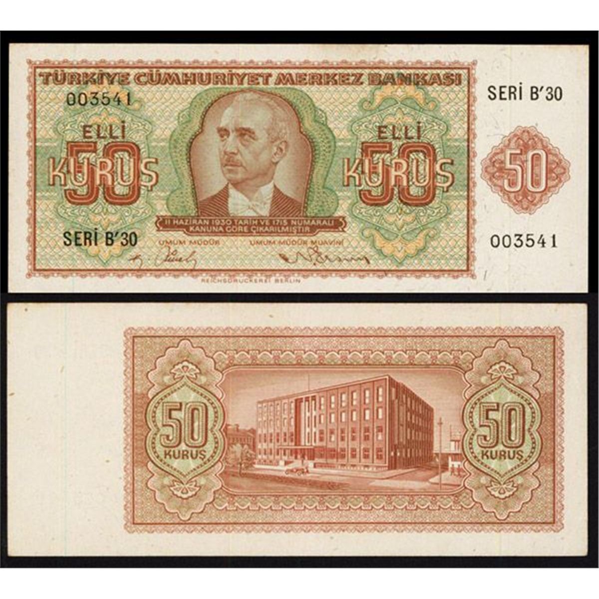 Turkey, L.1930 (1944), 50 Kurus, Seri B'30, P-134, Issued, Brown and green, President Inonu at center, Crisp Choice XF-AU condition with bright colors, firm paper, Scarce note in high grade.