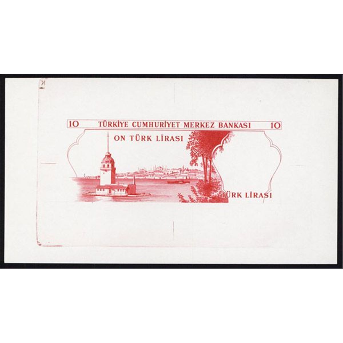 Turkey, L.1930, (1968), 10 Lira, P-180 Unlisted progress proof printed in red without underprint and partially engraved upper and lower borders, printed on large margined white paper. Choice to Gem Uncirculated Condition, rare proof. DBM-A (no imprint).