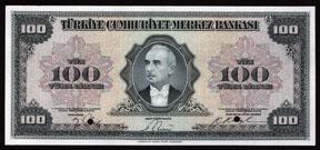 Fourth Issue (1947-48). 100 Lira, P-149 Unlisted Proof banknote. Printed on india paper that has separated from the large card it was printed on, but it is included with the note. Green on m/c underprint with portrait of President I.Inonu at center. No back included. Note appears Choice uncirculated, but there is 1/4 inch tear on the top middle margin that barely touches top design. Rare note in any form with minor faults but is still very attractive. ABNC.
