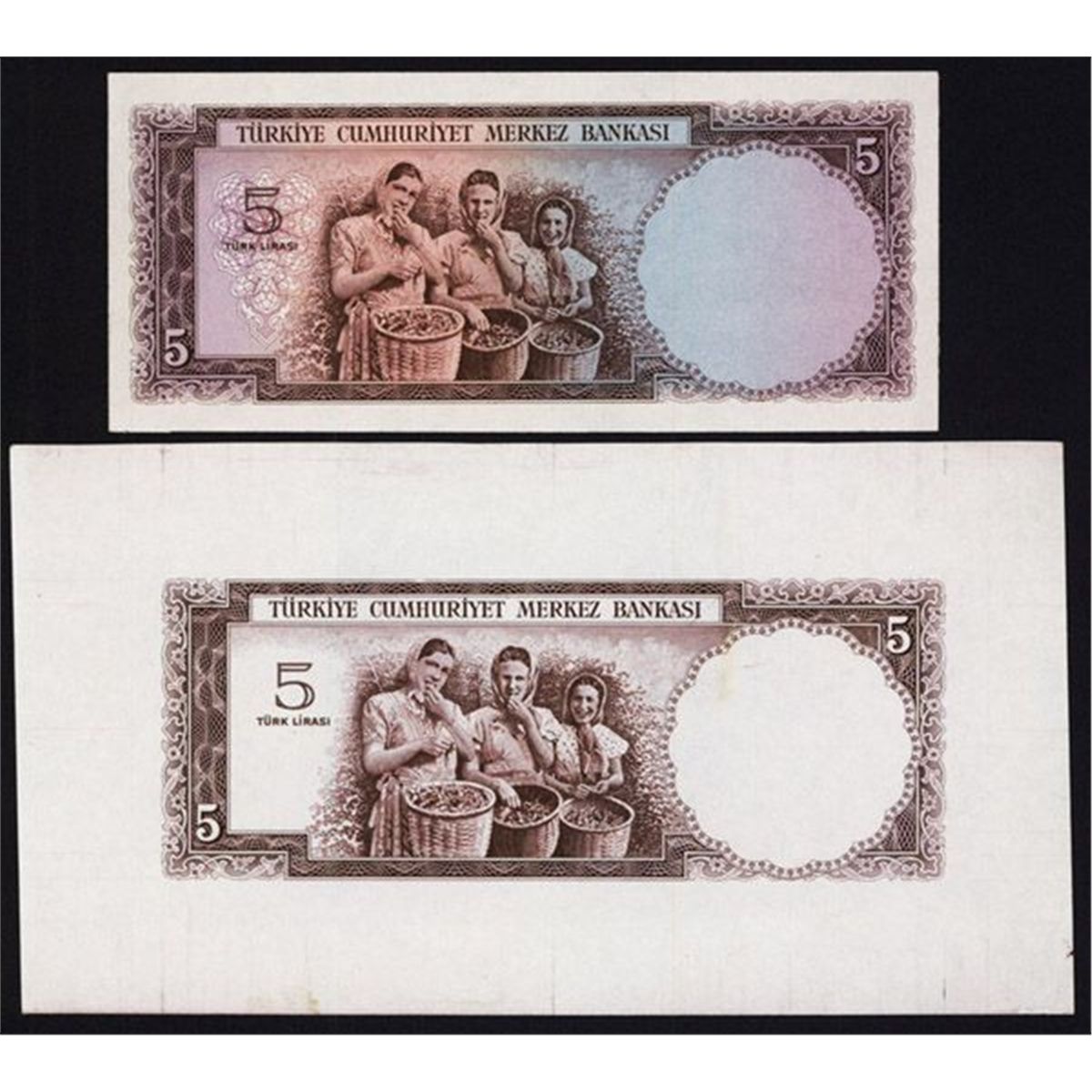 Turkey, L.1930, (ca.1952), 5 Lira, P-154 back proof pair, one printed in brown without underprint and the second printed in brown with a m/c underprint as issued, women with baskets of hazelnuts, both are choice to Gem Uncirculated. The note without the underprint has large margins and on the reverse a portion of an undertint from the face in a different direction, the note with the m/c underprint is cut down to banknote size with blank back, BWC.