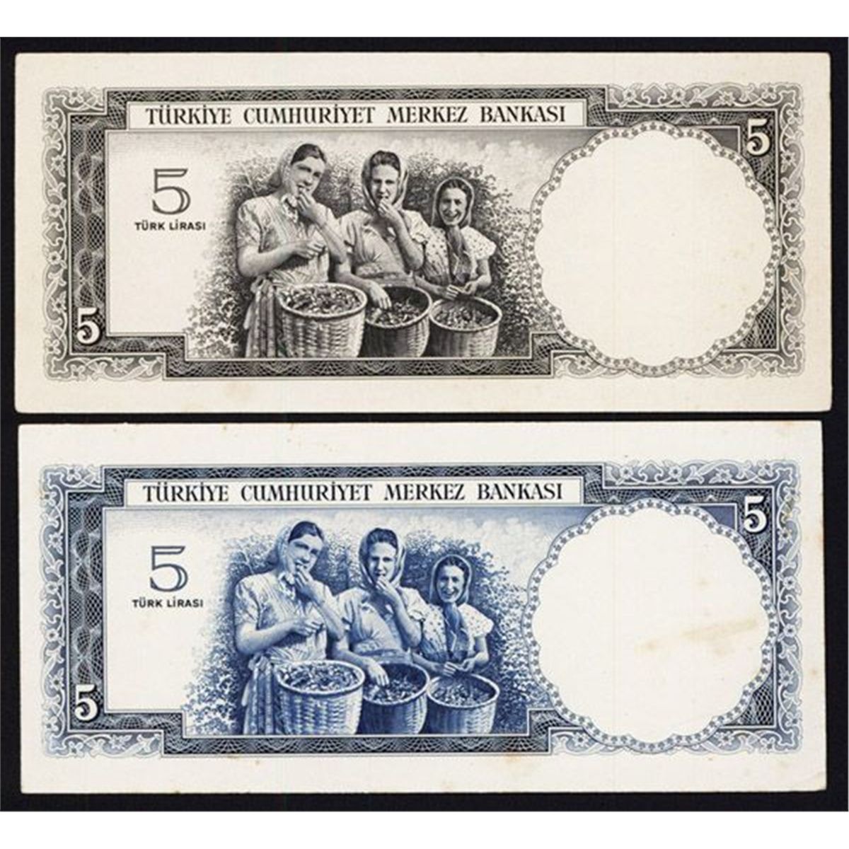 Turkey, L.1930, (ca.1952), 5 Lira, P-154 back proof pair, one printed in black and one in blue, both with no underprints and both cut down to banknote size, women with baskets of hazelnuts, both are choice AU to Uncirculated. BWC.