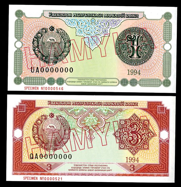 Central Bank of Uzbekistan, 1994, Pair of Specimen Banknotes Uzbekistan, pair of UNC specimen notes, includes 1 Sum, 1994, P-73s; and 3 Sum, 1994, P-74s.