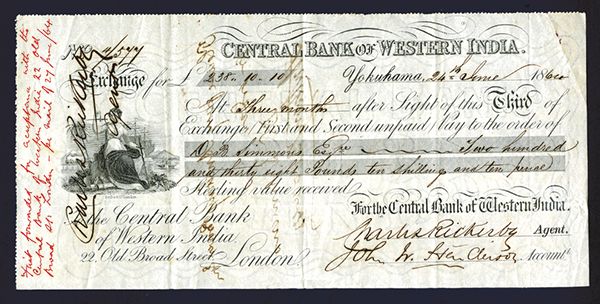 Yokohama, Japan, 3rd of Exchange Draft, 38 Pounds Sterling, 10/- 10 Pence, Black on watermarked light paper, Seated Justice at left. VF. Scarce early Japanese fiscal item.