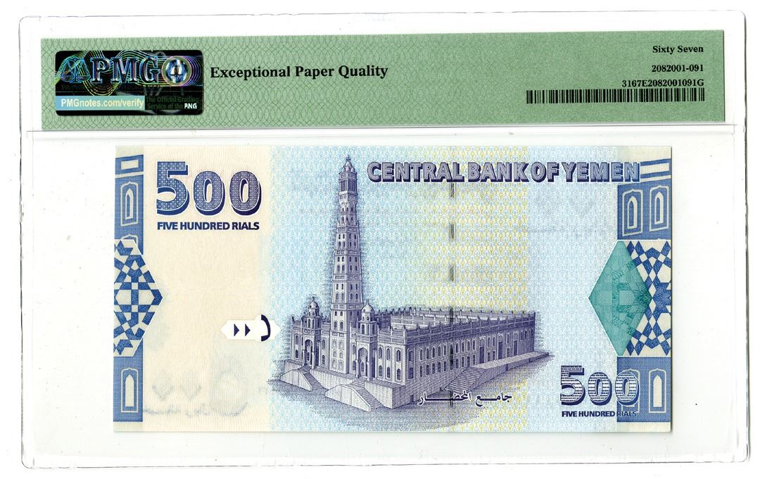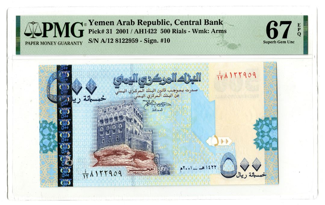 Yemen Arab Republic, 2001/AH1422. 500 Rials, P-31, Issued banknote, Light blue and multicolor, S/N A/12 8122959, Watermark: Arms, Sign. #10, PMG graded Superb Gem Uncirculated 67 EPQ.