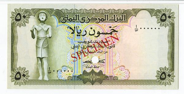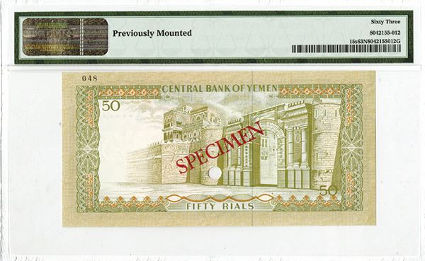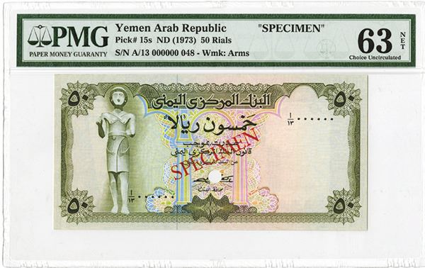 Yemen. Specimen 50 Rials, ND (1973), P-15s, number 048, PMG Choice Uncirculated 63 NET, previously mounted.