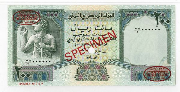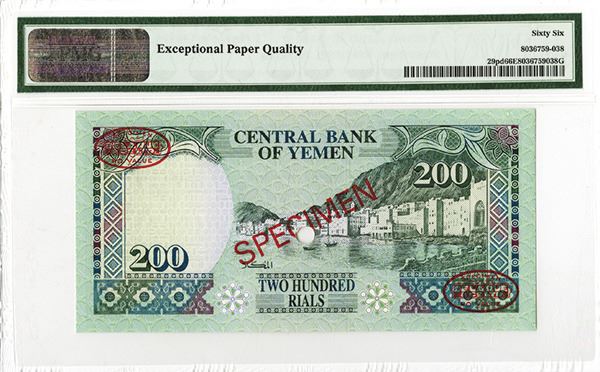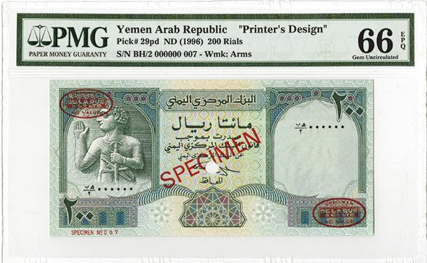Yemen. Printer's Design for 200 Rials, 1996, P-29pd, Specimen No. 007, TDLR oval overprints. PMG Gem Uncirculated 66 EPQ. Note: while PMG terms this a Printer's Design, we are unable to identify the characteristics that would distinguish this note from a Specimen note, P-29s.