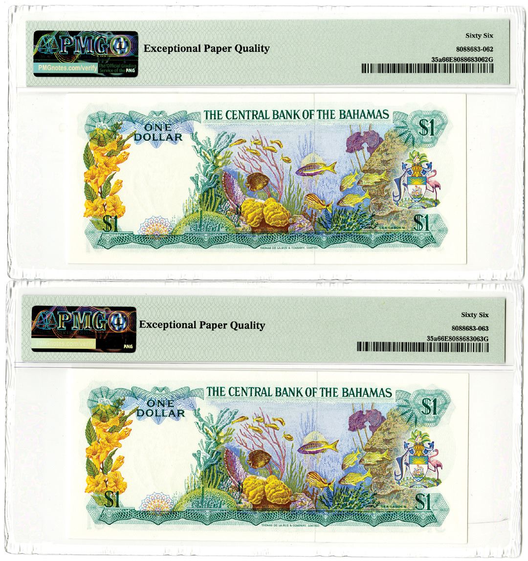 Bahamas. 1974. Lot of 2 Sequential pieces, both are: 1 Dollar, P-35a, Issued banknotes, Watermark: Shellfish, Sign. T.B. Donaldson, S/N's 735003 and 735004, both PMG graded Gem Uncirculated 66 EPQ. (2)