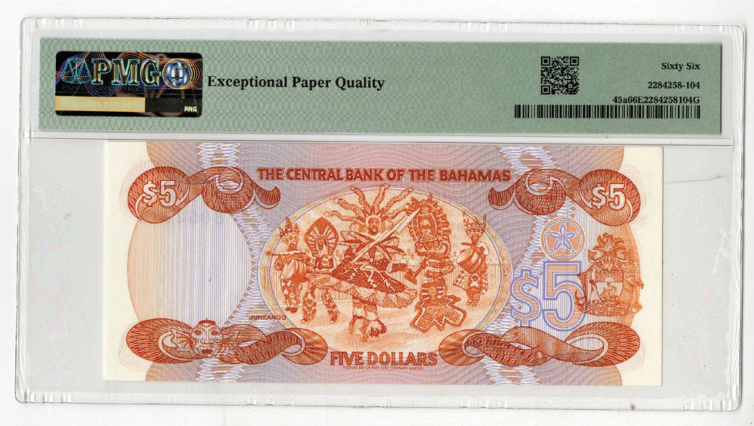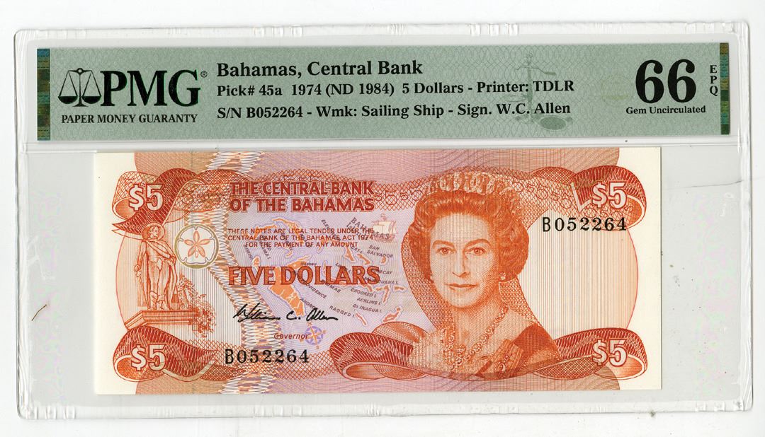 Bahamas, 1974 (ND 1984). 5 Dollars, P-45a, Issued Banknote, Orange on m/c underprint with map of area at left and Queen Elizabeth II at right, S/N B052264, PMG graded Gem Uncirculated 66 EPQ, TDLR.
