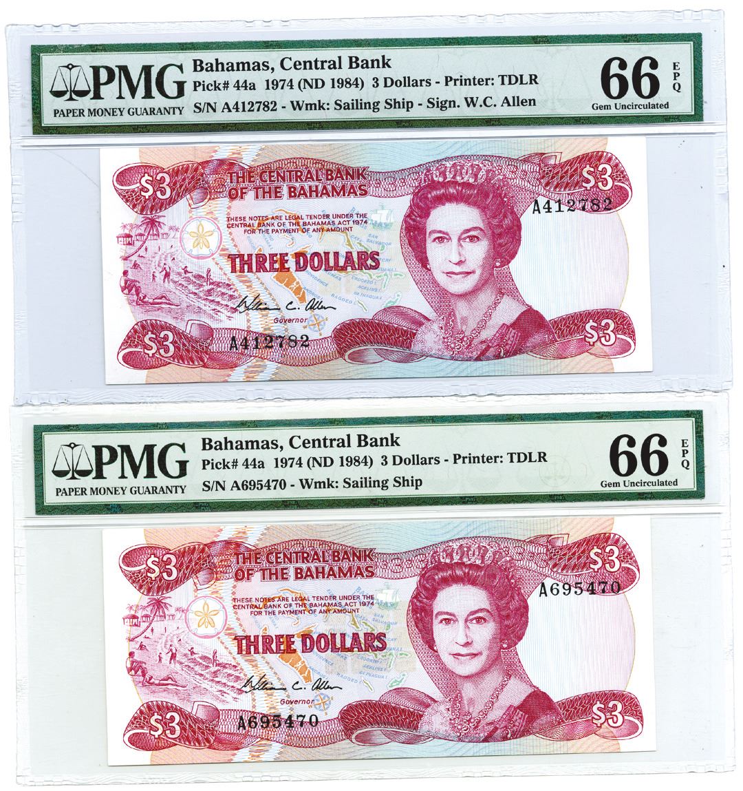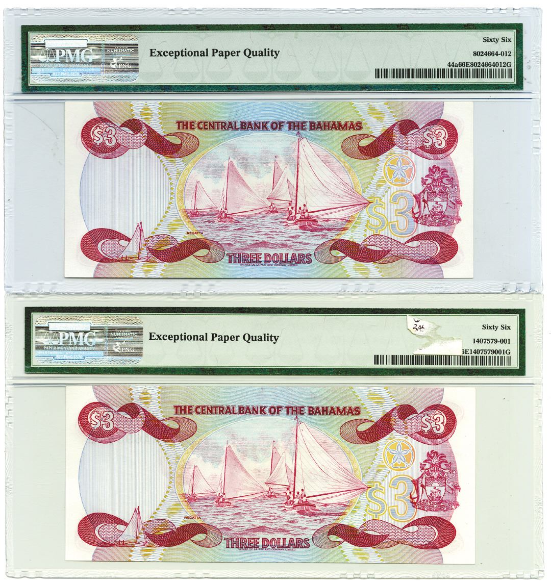 BahamasÉ Pair of $3, 1974 (ND 1984), P-44a (2), Red-violet on m/c underprint, Paradise Beach at left, map at center left, mature portrait of Queen Elizabeth II at center right, back shows Family Island sailing regatta, arms at right, PMG graded 66 Gem UNC EPQ, TDLR.
