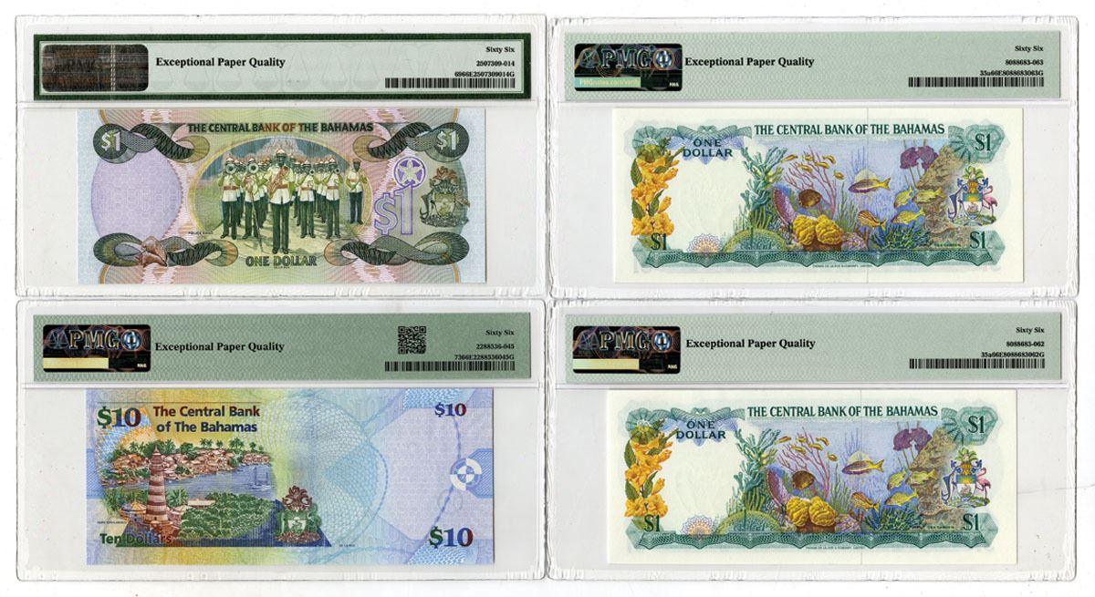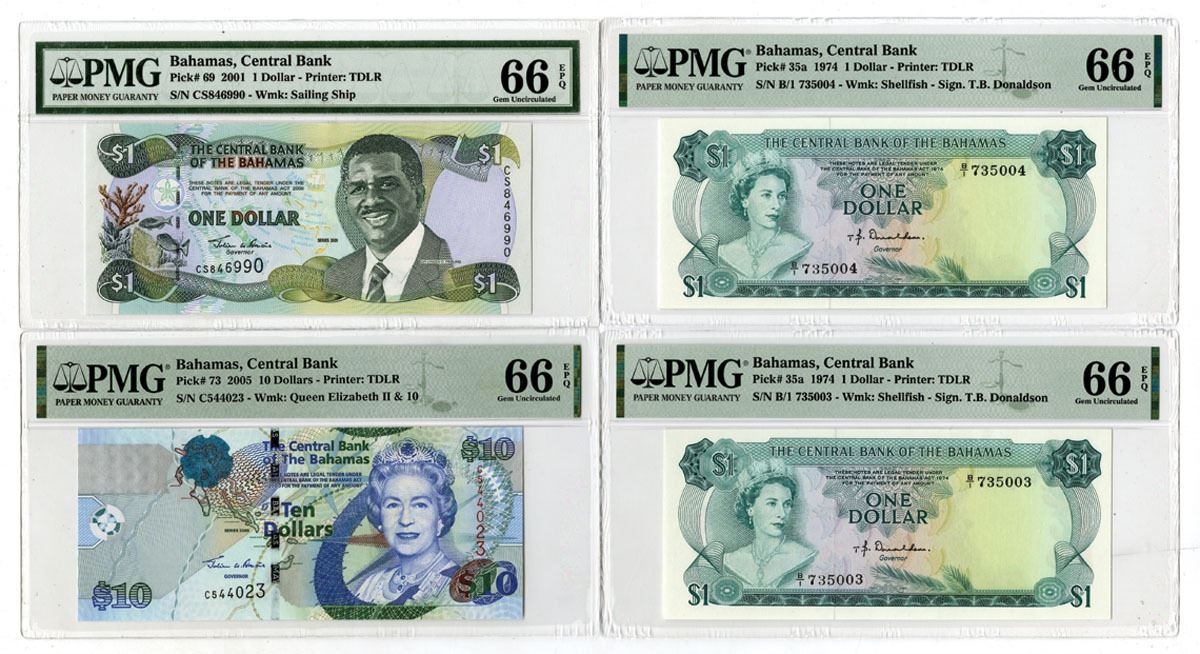 Bahamas, 1974-2005. Lot of 4 PMG graded Issued Banknotes, Includes $1, P-35a (2) Sequential Pair, S/Ns B/1 735003 & B/1 735004, Both are Gem Uncirculated 66 EPQ, TDLR; $1, P-69, S/N CS846990, Gem Uncirculated 66 EPQ, TDLR; $10, P-73, S/N C544023, Gem Uncirculated 66 EPQ, TDLR. (4). Sold "AS IS" no returns accepted.