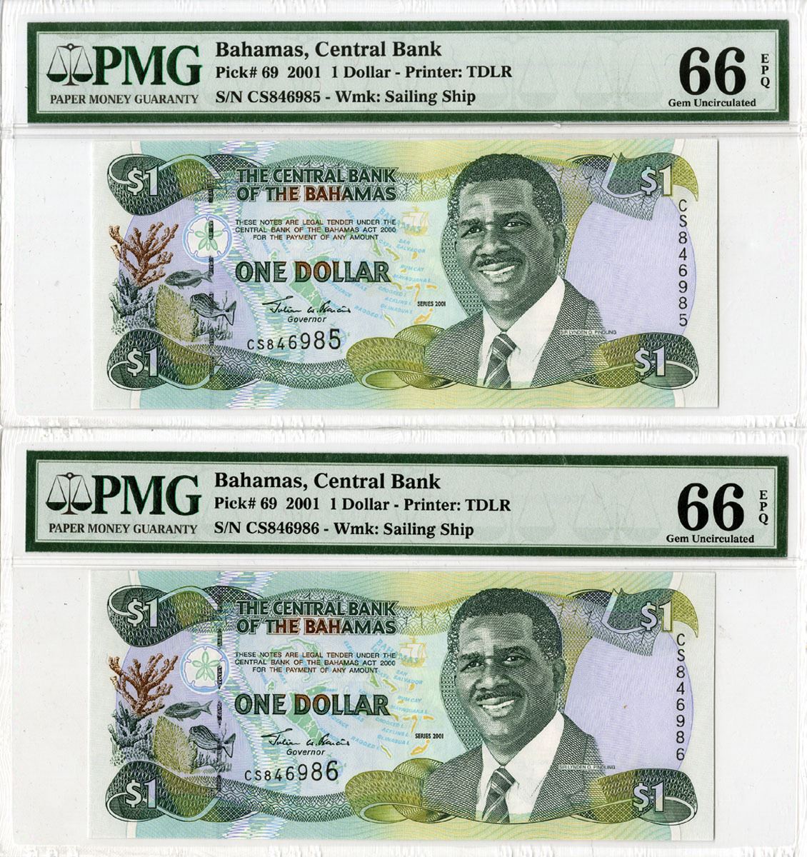 Bahamas, 2001. Lot of 2 Sequential $1, P-69, Issued Banknotes, S/Ns CS846985 & CS846986, Both are PMG graded Gem Uncirculated 66 EPQ. (2). Sold "AS IS" no returns accepted.