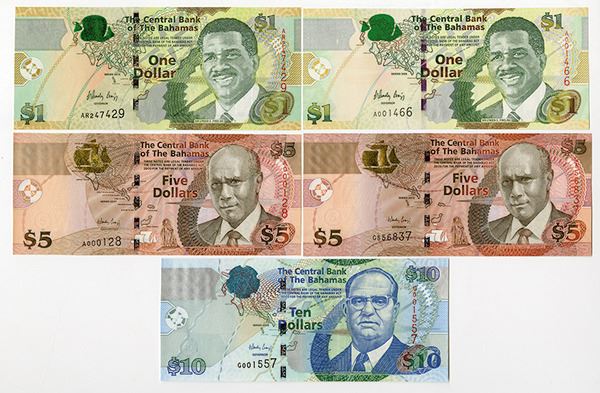 Bahamas. Lot of 5 notes, Includes $1, 2008 and 2015, P-71 and 71A, A and AR Prefix; $5, 2007 and 2013, Low S/N A000128 and G prefix; and $10, 2009, P-73A, G prefix, All CU to Gem Uncirculated. Attractive assortment.