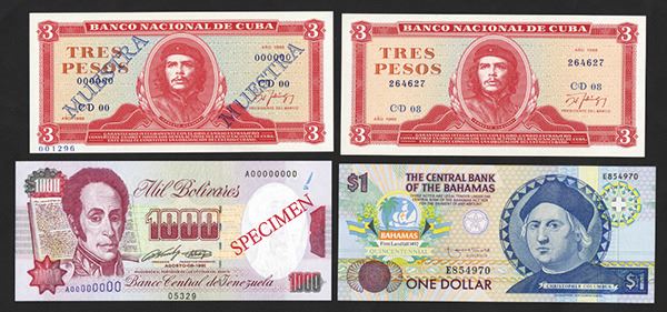 Venezuela, Includes Cuba, specimen 3 Pesos, 1988, P-107bs, featuring Che Guevara on obverse, UNC, and matching issued note, also UNC; Venezuela, specimen 1000 Bolivares, 1991, P-73s1, UNC; and finally Bahamas, issued 1 Dollar, 1992, P-50, commemorative issue, Choice to Gem uncirculated condition.
