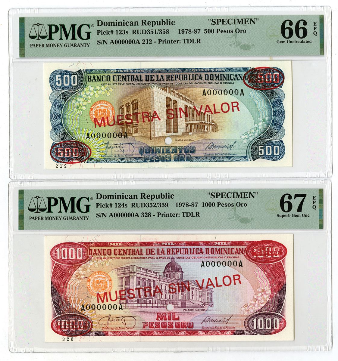 Dominican Republic, 1978-87. Lot of 2 Specimen Banknotes, Includes: 500 Peso Oro, P-123s RUD351/358, S/N A000000A 212, PMG graded Gem Unc 66 EPQ; 1000 Peso Oro, P-124s, S/N A000000A 328, PMG graded Superb Gem Unc 67 EPQ. Both notes have specimen overprints and POCs and were printed by TDLR. (2). Sold "AS IS" no returns accepted.