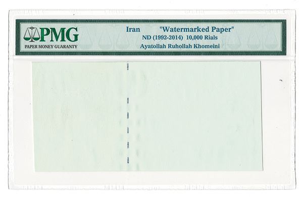 Iran. Lot includes watermarked security paper with security thread as prepared for 10,000 Rials note, featuring Ayatollah Ruhollah Khomeini's likeness as the watermark, in PMG holder. P-146. Unc.