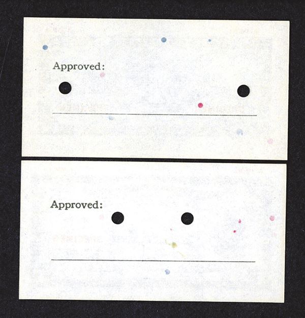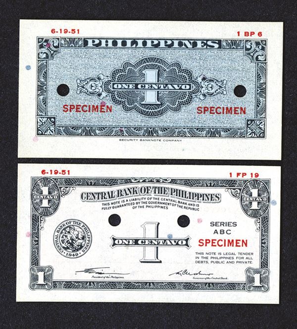 Philippines, 1949. P-Unlisted. 1 Centavo. Uniface front and back essay specimens or proofs. Red specimen overprint and POC's. Unreleased and unissued 1 Centavo denomination. 65 x 30 mm. Face with black border with light peach undertint, the back with black border and light blue underprint. Face has a red overprint on upper top margin dated 6-19-(19)51 and 1 FP 19. Back has 6-19-51 date and 1 BP 6 printed on top margin in red. Face and backs have line for approval signatures on back. Choice to Gem Uncirculated. Rare. SBNC.