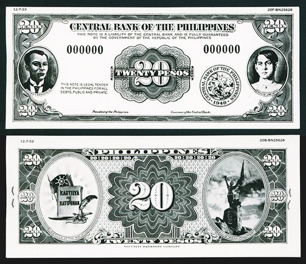 Philippines, 1949 (1953). 20 Pesos. P-Unlisted Design Proposal by SBNC for the 20 Pesos Face and back, P-137 printed by TDLR. Photographic proof cut down to banknote size and front and back stapled together. Archival production proofs evidently for evaluation of design that was proposed but not accepted by the Philippine Government. Choice to Gem Uncirculated condition. Face has a text on upper top margin with date "12-7-53" and "20F-BN25620", back is blank. Rare essay photographic proof banknote. This note is composed of 2 banknote sized photographs cut down to banknote size and stapled on the sides together by SBNC. Extremely rare production proof.