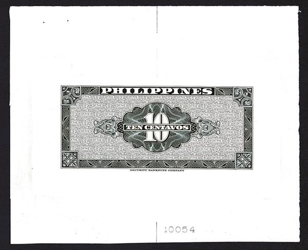 1949. P-127 Unlisted proof. 10 Centavos uniface Large die proof back note printed on white glossy paper. 100 x 47 mm. Intaglio printed. Black border with no undertint. Choice Uncirculated. Rare. SBNC