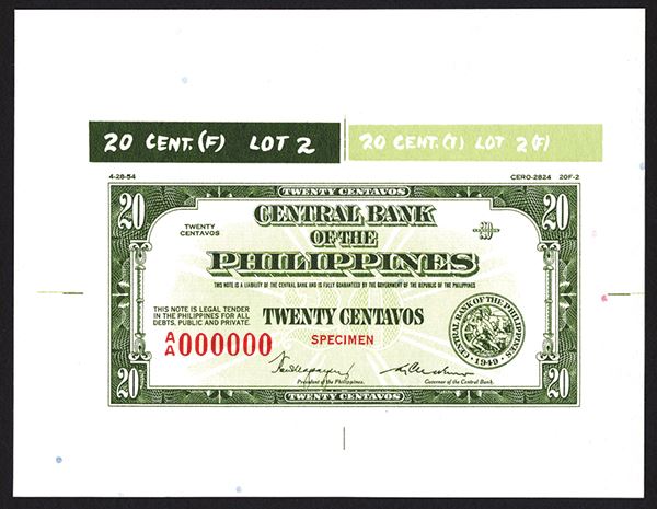Philippines, 1949. P-Unlisted Essay banknote. 20 Centavos. Uniface front essay with Dark green border and text with light olive-green underprint, color bars in green and light olive green on top. Red "00000" serial numbers. Printed on planchetted bank note paper. Unreleased and unissued 20 Centavos, top margin with date 4-28-54 and "Cerro-2824 20F-2". Choice to Gem Uncirculated. Rare unreleased banknote design from SBNC.