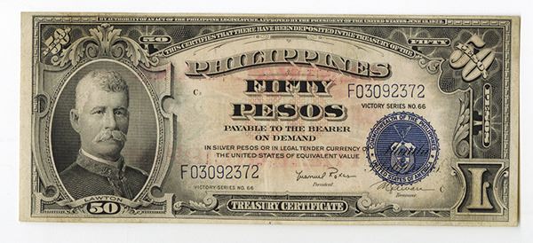 Philippines. Issued 50 Pesos, P-122b, overprinted "VICTORY SERIES", Choice Very Fine condition. USBEP.