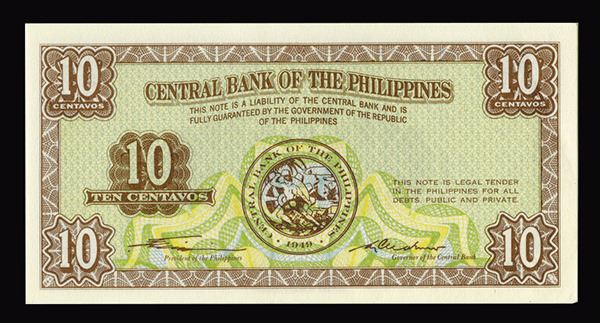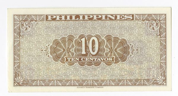 Philippines, 10 centavos, P-Unlisted, Specimen banknote without markings or serial numbers, Brown on light green, back light brown, unlisted and unreleased banknote design, from a new find. Choice AU to Uncirculated with one light corner tip bend keeping the note from CU, Jeffries Bank Note Co.
