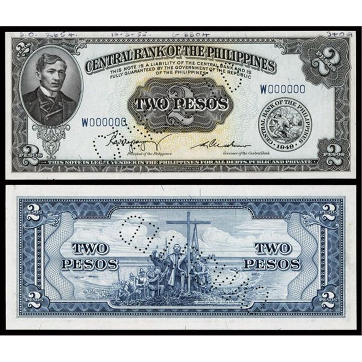 Philippines, 1949, 2 Pesos, P-134s3, Specimen banknote, Black on blue and gold underprint, Rizal on left. Uncirculated to CU condition, W000000 serial numbers, pin punch “CANCELLED” overprint, Archival notations on top margin with date “16-3-(19)55” and control numbers, scarce De La Rue specimen. Archivally folded lightly 6 or 7 times, otherwise this would have been a Choice AU Note. Attractive and scarce. TDLR.