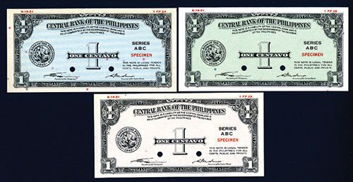 Philippines, 1949, Lot of 3 notes, all 1 cent Specimens, All unlisted in SCWPM, all are 108 mm x 54 mm, All with black border and text, but different undertints, Light peach, Light blue or Light green, All with Specimen overprints and POC's, Rare Essays. SBNC/