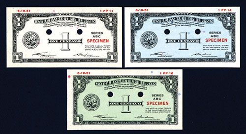 Philippines, 1949, Lot of 3 notes, all 1 cent Specimens, All unlisted in SCWPM, all are 71 mm x 33 mm, All with black border and text, but different undertints, no underprint, Light blue or Light green, All with Specimen overprints and POC's, Rare Essays. SBNC/