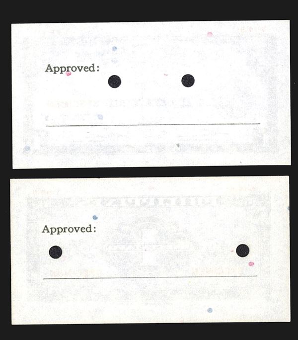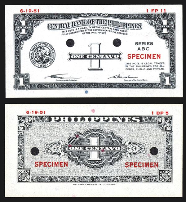 Philippines. 1949 (dated 6-19-(19)51. 1 Centavo. P-Unlisted. Uniface front and back essay specimen. Red specimen overprint and POC's. Unreleased and unissued 1 Centavo denomination. 70 x 35 mm. Black border with no undertint color, Choice to Gem Uncirculated condition. Face has a red overprint on upper top margin dated 6-19-51 and back has 6-19-51 date and 1 BP 5. Face and backs have line for approval signatures on reverse. SBNC.