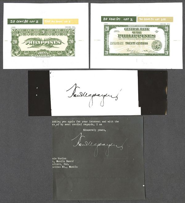 Philippines, 1949, 20 Centavos. P-Unlisted, uniface face and back pair, both in dark olive green with light tan undertint, Essay Banknotes, Large upper margins with tint blocks of border and undertints. Unreleased and unissued 20 Centavos essay color trial. Dark green border with light green undertint on face. the seal on the right is untinted. Face has a green overprint on upper top margin with date 4-28-54 and "CERO-2824. Printed by SBNC. Rare Essay note. Choice to Gem Uncirculated. Rare notes in any form or condition.
