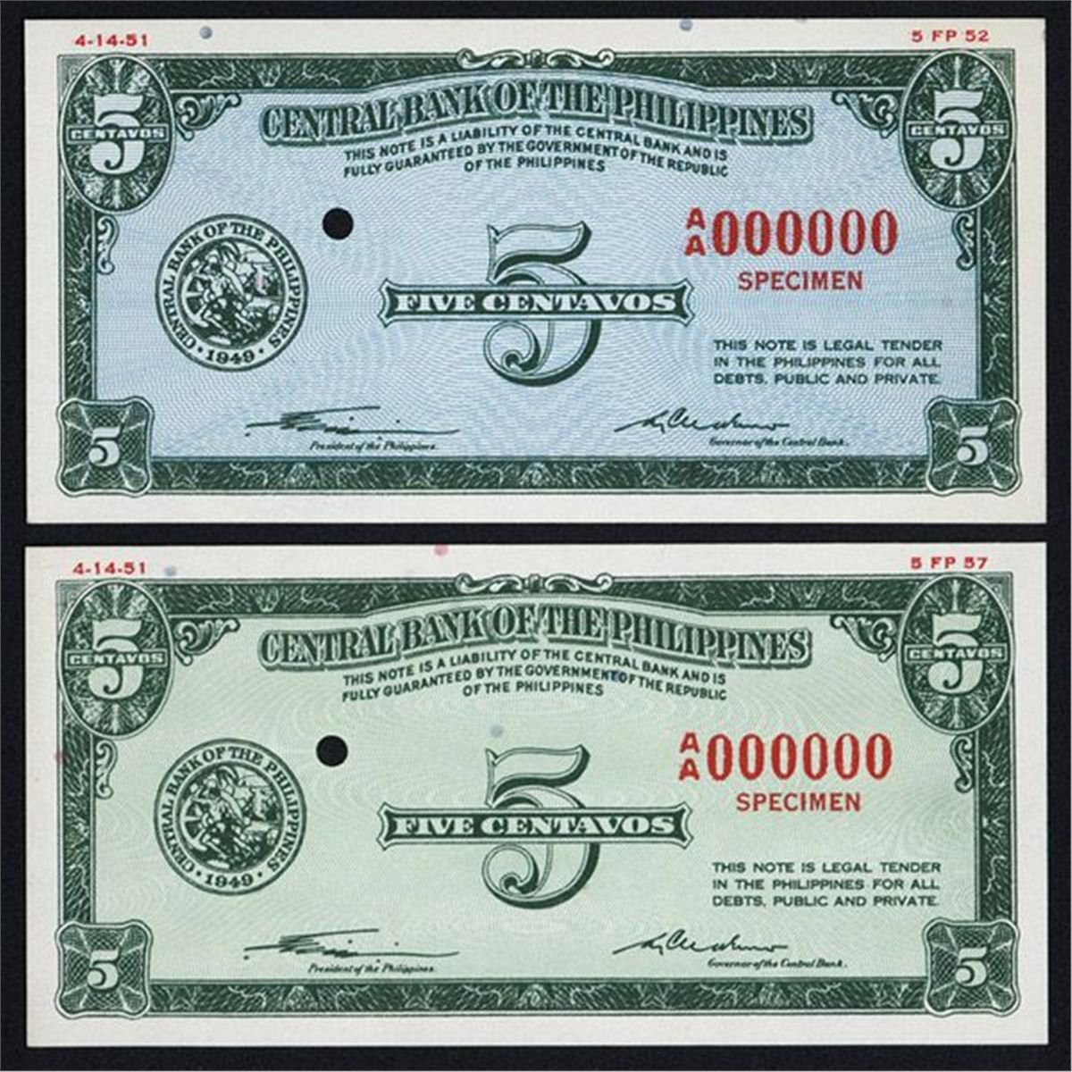 Philippines, 1949, Lot of 2 notes. Both are 5 Centavo, P-125 Color Trial essay banknotes by Security BNC. Both are uniface specimen faces. Both measure 108 x 53 mm's. Both have dark green frames, one has light blue underprint with date “4-14-51” on top left “5 FP 52” on top right and the other has light green underprint with date “4-14-51” and “5 FP 57” on top margin. Both with POC's, red specimen overprints and “00000” serial numbers. Backs have line for approval signatures otherwise blank. Choice Uncirculated. Rare Philippine color trials. SBNC. (2)