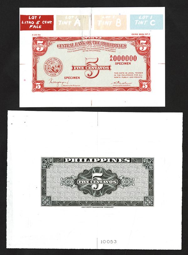 Philippines, 1949. P-Unlisted. 5 Centavos color trial. Uniface front essay specimen and proof back specimen. The face is red on light blue underprint and printed by lithography with Red specimen overprint and "00000" serial numbers, Large margin on top with color blocks of border and undertint colors. The back is intaglio printed in black, Unreleased and unissued 5 Centavos color trial. Face has a red overprint on upper top margin with date 4-28-54 and "Cerro 2824 5F-1". The face would grade uncirculated but there was a paper clip that just touched the top margin and leaves a thin rust line, the back is uncirculated. Scarce pair of notes.
