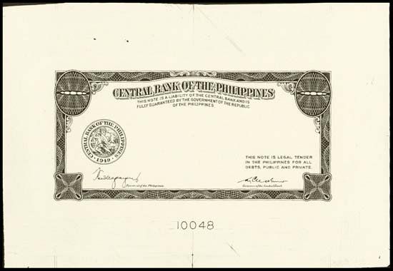 1949. P-Unlisted. 5 Centavos proof base note without denomination. Uniface front and back essay proofs. Unreleased and unissued 5 Centavos denomination large die proof base notes printed on white glossy paper . 100 x 41 mm. Black border with no undertint. Face LDP has plate # 10048 and back proof has plate # 10052. Choice Uncirculated. Rare. SBNC.
