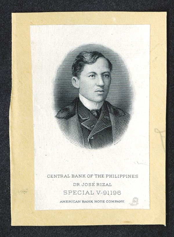 Philippines. Black ink proof on india paper mounted to card. ABNC special die # V91196. Portrait does not match any used on circulating currency, but very well done.