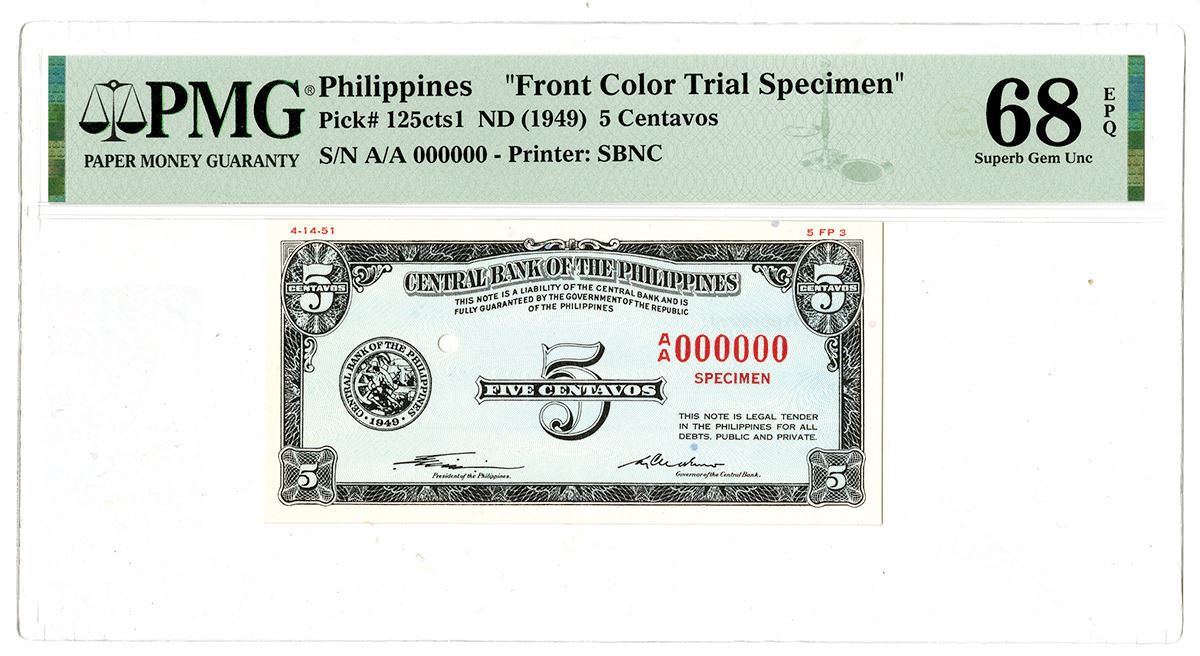 Philippines, ND (1949). 5 Centavos, P-125cts1, Essay Obverse Color Trial Specimen, Black on light blue underprint, S/N A/A 000000, PMG graded Superb Gem Uncirculated 68 EPQ. Printer: SBNC.