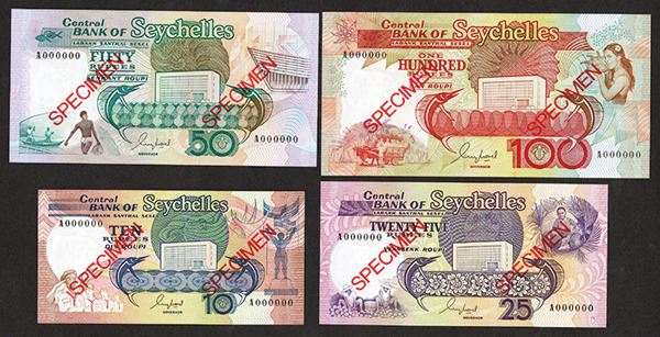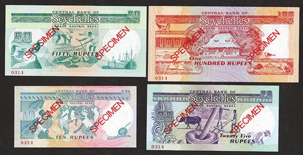 Seychelles. 10, 25, 50, 100 Rupees. P-32s; 33s; 34s; 35s. Unlisted as Specimens. Bank building at center. A000000 number on all. Red overprint SPECIMEN on both sides, matching 0314 at margin in lower right corner. All Choice Uncirculated. 4 pieces.