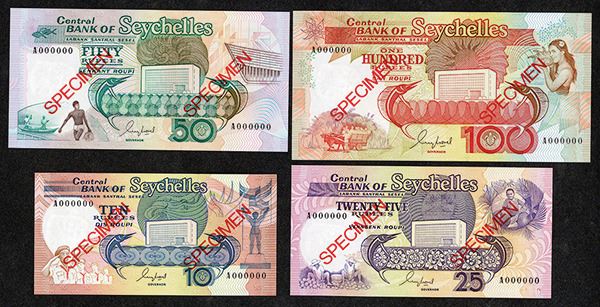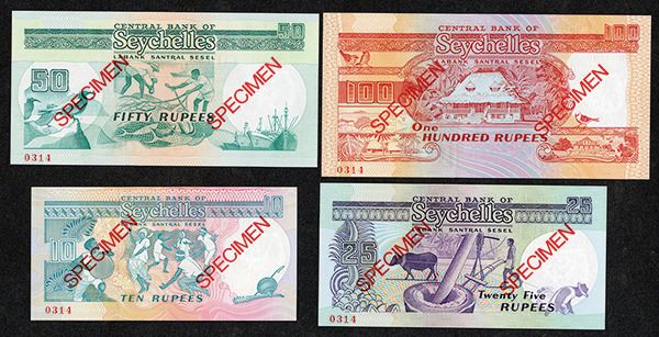 Seychelles. 10, 25, 50, 100 Rupees. P-32s; 33s; 34s; 35s. Unlisted as Specimens. Bank building at center. A000000 number on all. Red overprint SPECIMEN on both sides, matching 0314 at margin in lower right corner. All Choice Uncirculated. 4 pieces.