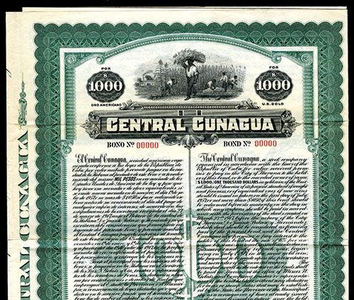 Cuba, 1917, $1000, 6% Specimen Bond, Black on green border and underprint, Sugar cane farmers top center, POC's, red SPECIMEN overprints, VF condition, ABNC. Bond is in both English and Spanish.