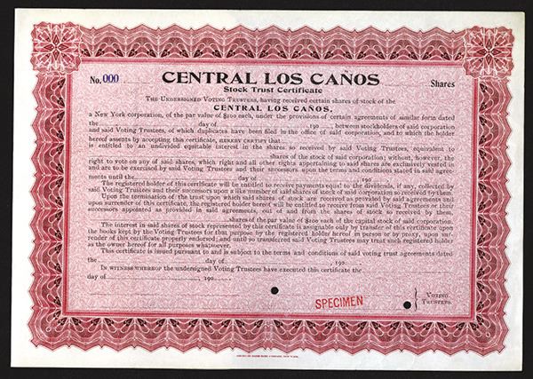 New York, 190x (ca.1900-1910's), Specimen Stock, Odd Shares, Black on red border and underprint, No vignette, VF-XF condition, ABNC. From the Rionda Archives, evidently sugar related company. ABNC.