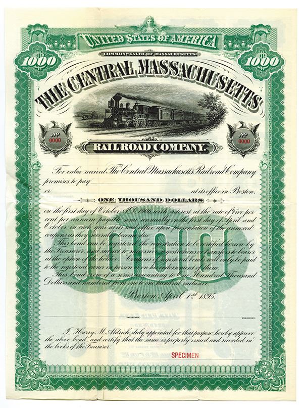 Massachusetts, $1000 Specimen 5% Coupon Bond. Black on green border and under print, Locomotive R-L passing countryside, VF condition, POC's, Listed railroad, Unlisted and previously unrecorded bond in Cox. 3 found in archives. ABNC.