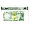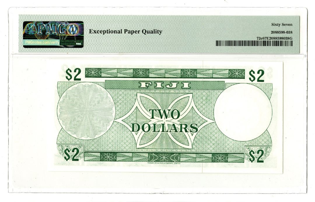 Fiji, ND (1974). $2, P-72c, Issued Banknote, Green with light yellow and blue underprint, Portrait of Queen Elizabeth II at right, S/N B/4 396963, Printer: TDLR, PMG graded Superb Gem Uncirculated 67 EPQ. Only 1 note grades higher out of 37 graded in the PMG census.