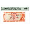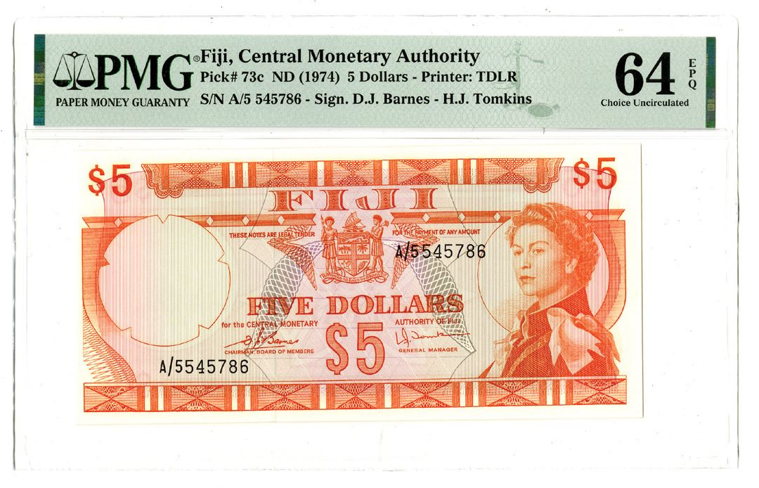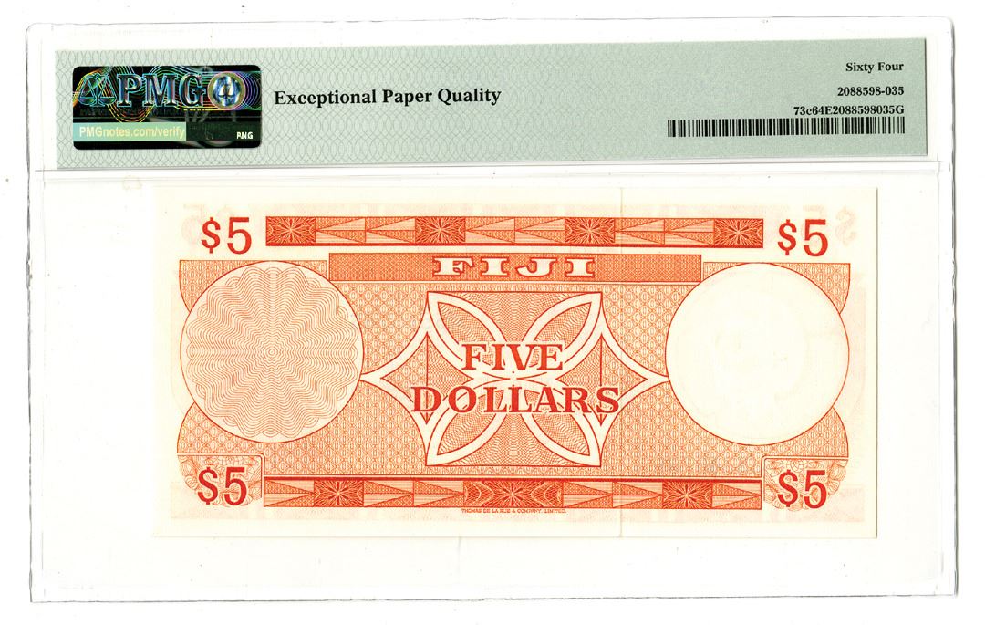 Fiji, ND (1974). $5, P-73c, Issued Banknote, Orange with purple and m/c underprint, Portrait of Queen Elizabeth II at right, S/N A/5 545786, Printer: TDLR, PMG graded Choice Uncirculated 64 EPQ.