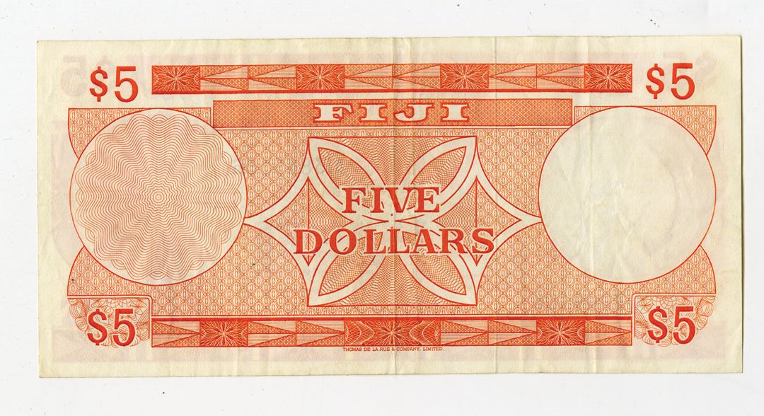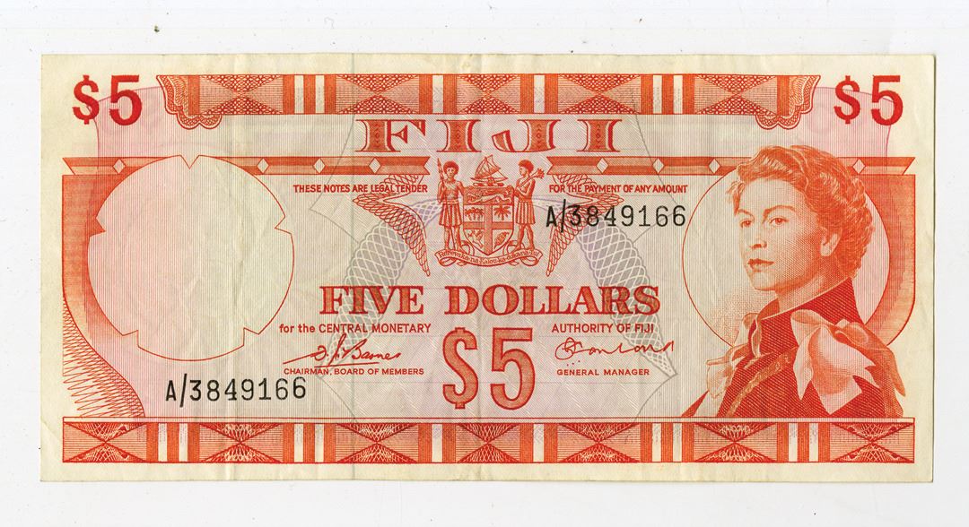 Fiji, ND (1974). 5 Dollars, P-73b, Issued Banknote, Orange on purple and gray underprint, Queen Elizabeth II at right and arms at center, Title of "Fiji" at top center, Back is orange with geometric design, S/N A/3849166, VF-XF condition, TDLR.
