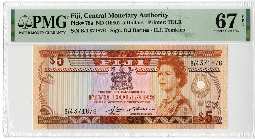 Fiji, ND (1980). $5, P-78a, Issued Banknote, Red/brown on m/c underprint with the late Queen Elizabeth II at right, S/N B/4 371876, Printer: TDLR, PMG graded Superb Gem Uncirculated 67 EPQ.