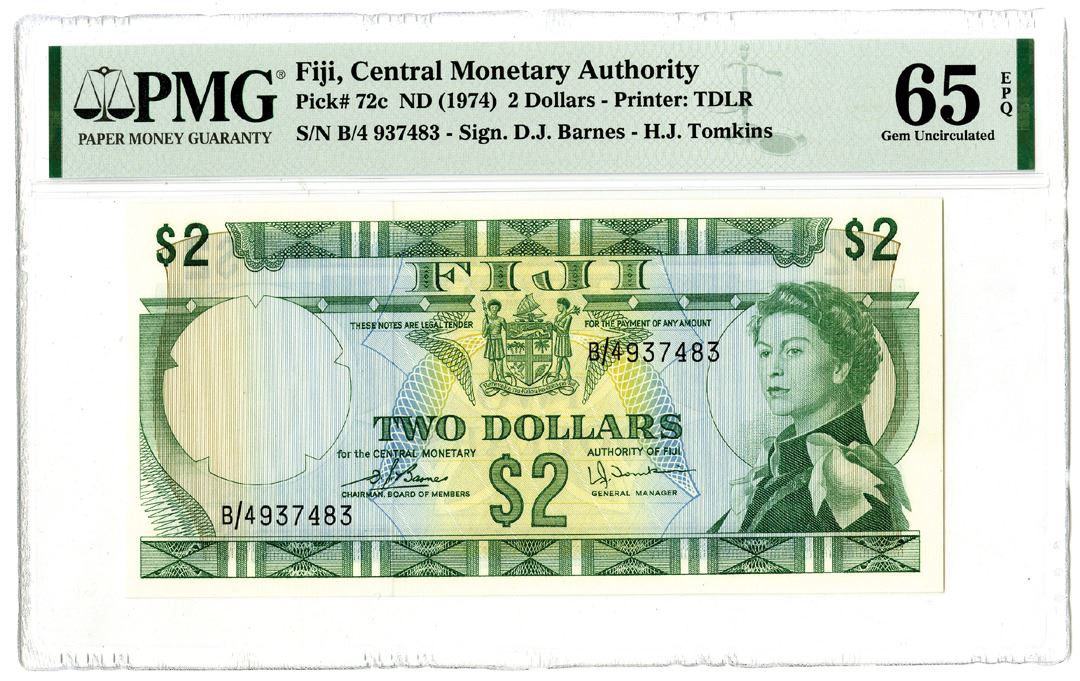 Fiji. ND (1974). 2 Dollars, P-72c, Issued banknote, Green with Queen Elizabeth II at right, S/N B/4 937483 - Sign. D.J. Barnes - H.J. Tomkins, PMG graded Gem Uncirculated 65 EPQ.