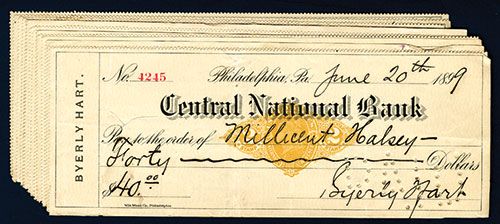 Philadelphia, 1899, I/C, Checks from Central National Bank Lot of 14, 2cent orange revenue stamp imprint, Fine-VF condition lot.