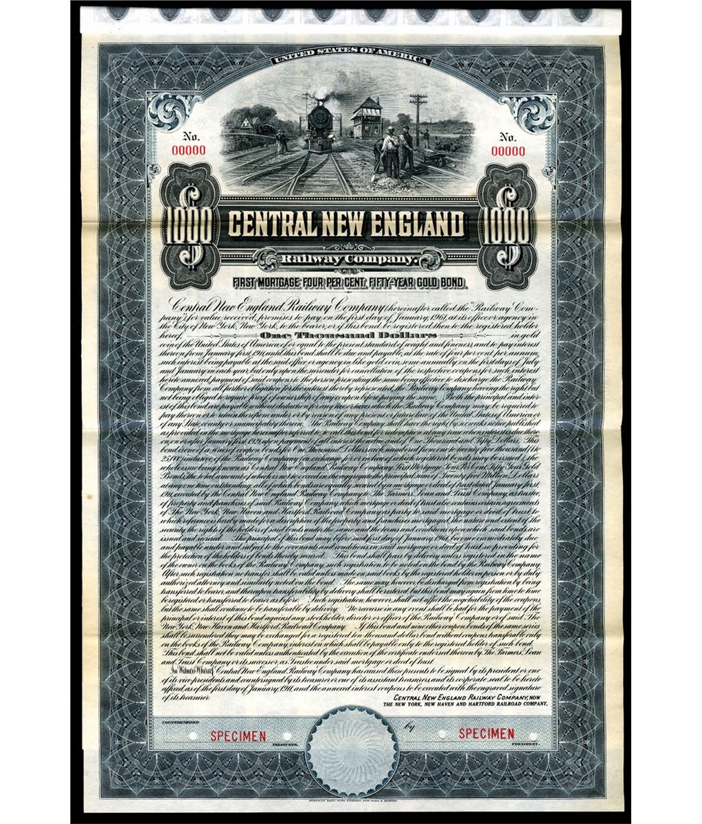 $1000 1st Mortgage 4% Gold Coupon Bond Specimen, Blue border and undertint. Locomotive straight on passing small station and track workers. Coupons attached. XF condition, POC's. ABNC. Unlisted Railroad in Cox. Rare and attractive.